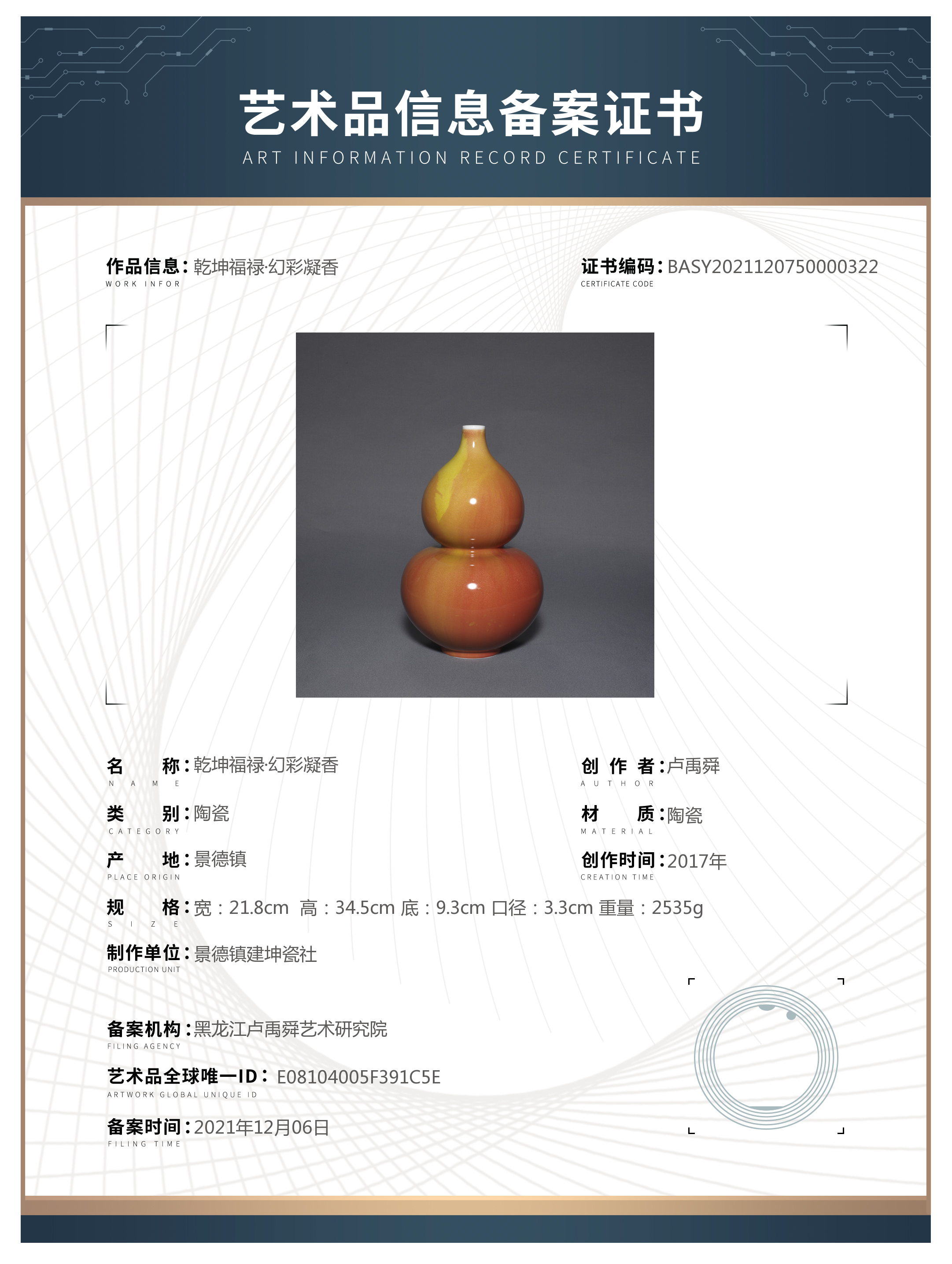 All the original information related to artworks on the certificate is provided by applicants who authorize China Artworks Authentication Center to conduct a technical filing and issue relevant filing certificate.